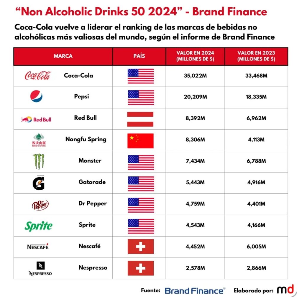 Por su parte, el Top 3 lo completan Pepsi, cuyo valor de marca supera en 2024 los US$20.000 millones y Red Bull, que registra US$8.000 milloneS.