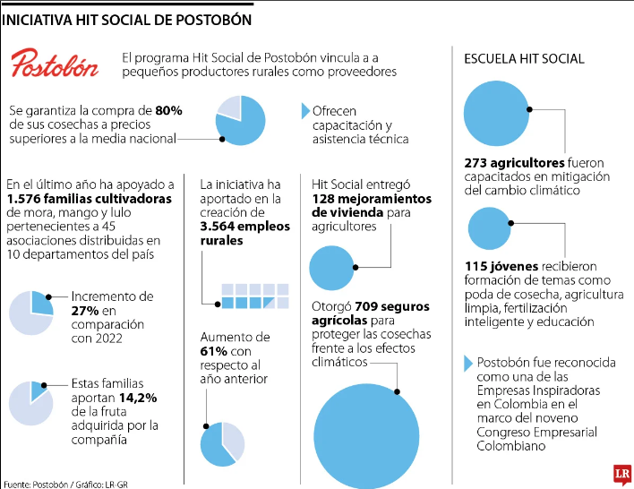 El programa Hit Social de Postobón es una iniciativa que vincula a pequeños productores rurales como proveedores, de esa manera garantiza la compra de 80% de sus cosechas a precios superiores a la media nacional, además de ofrecer capacitación y asistencia técnica.