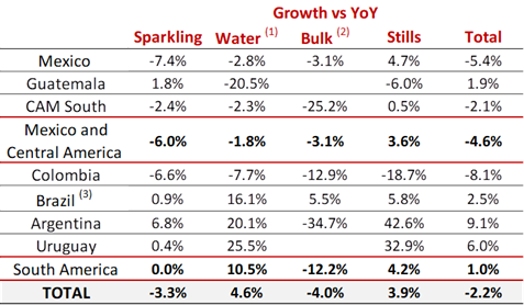 - Volumen total cayó 2.2%, afectado por disminuciones en México y Colombia, parcialmente compensadas por crecimientos en Brasil, Argentina, Uruguay y Guatemala.